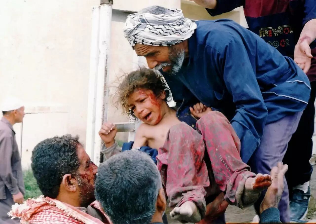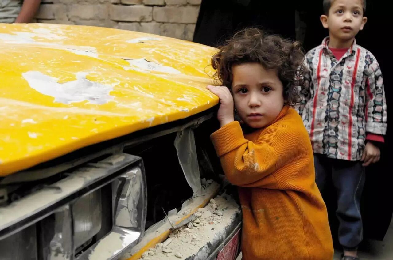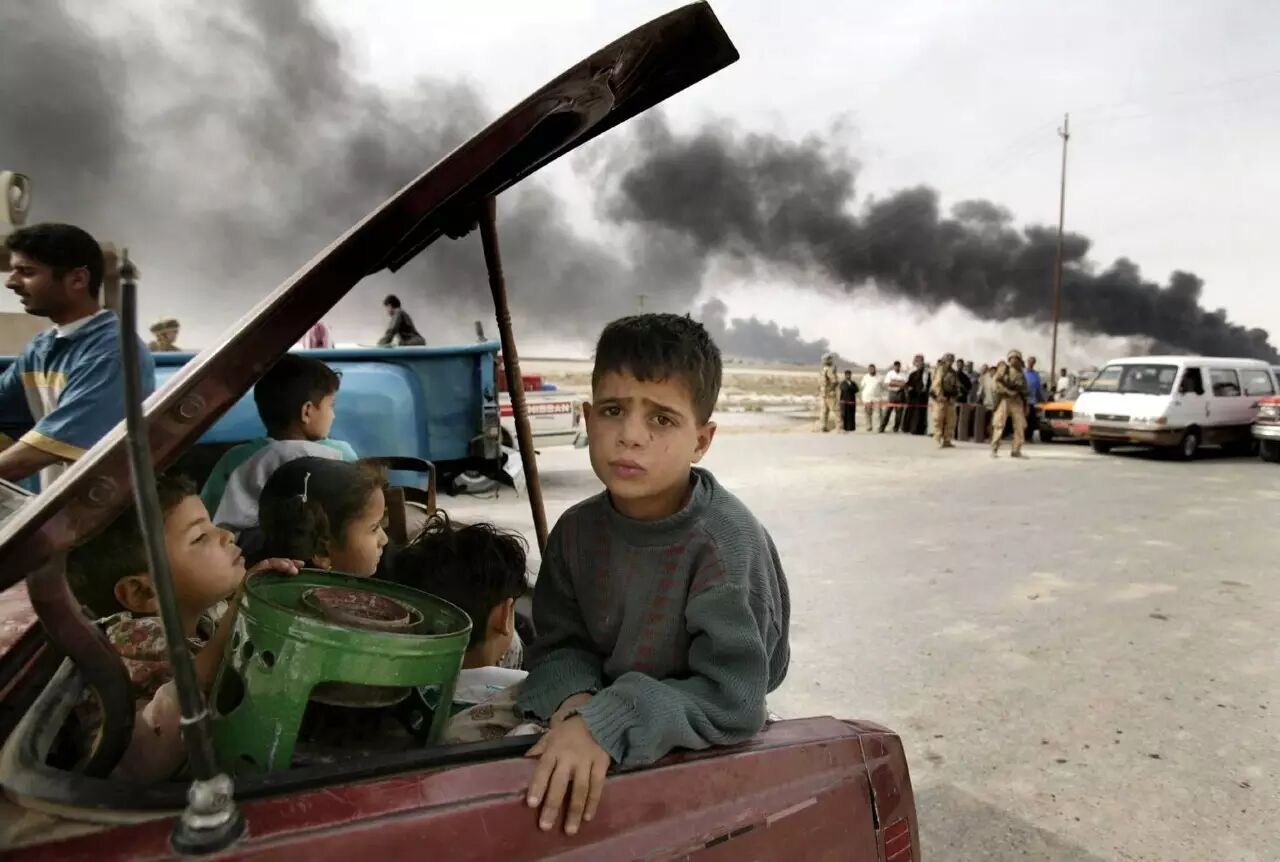 2003年4月,战争阴影下的伊拉克儿童。在这里,人命就是筹码,死亡就是数字,道德就是玩笑。子弹不长眼,女性、儿童,战争的镰刀收割时从不问对象。