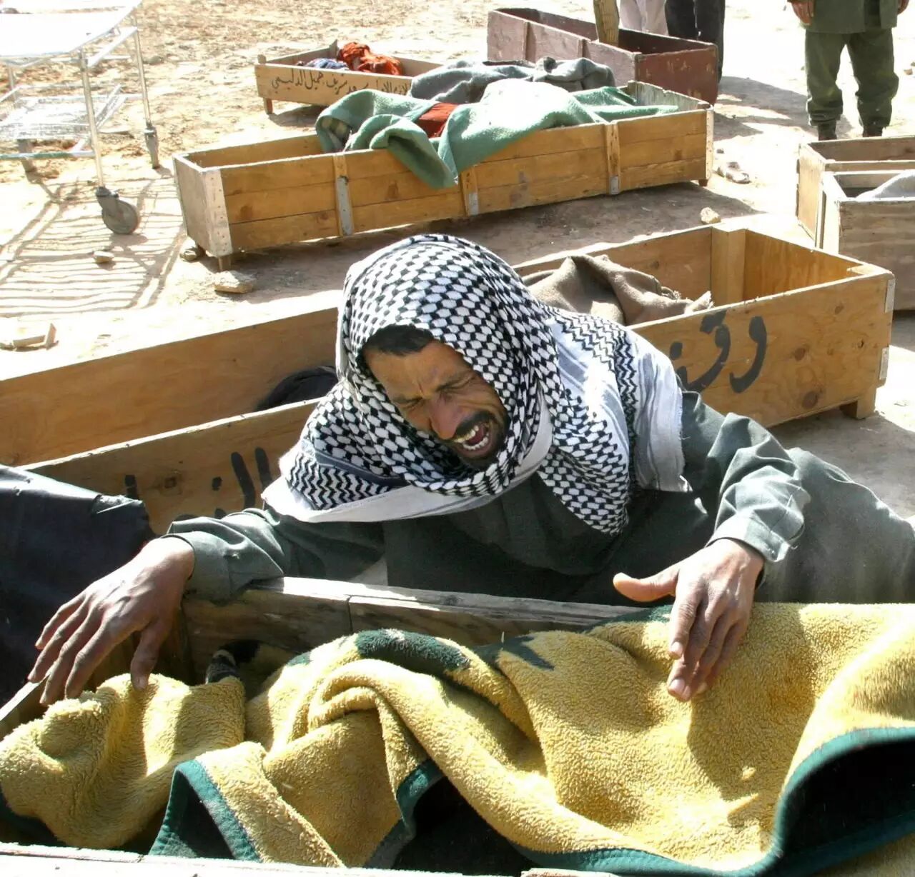 2003年4月1日,在伊拉克巴比伦省一户农家院内,一名男子在母亲的棺椁前悲痛哭泣。美英联军的轰炸造成这名男子的15名亲属死亡。