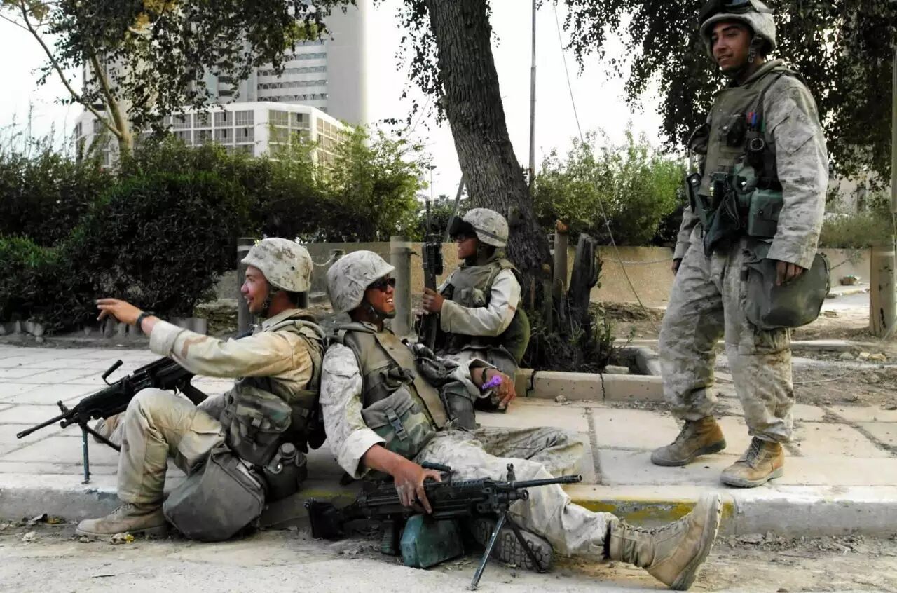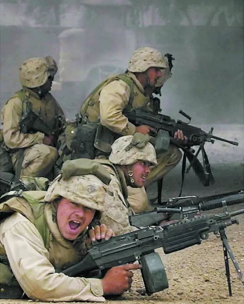 2003年4月9日,在巴格达市内的战斗中,美国海军陆战队的士兵 在为友军提供火力掩护。