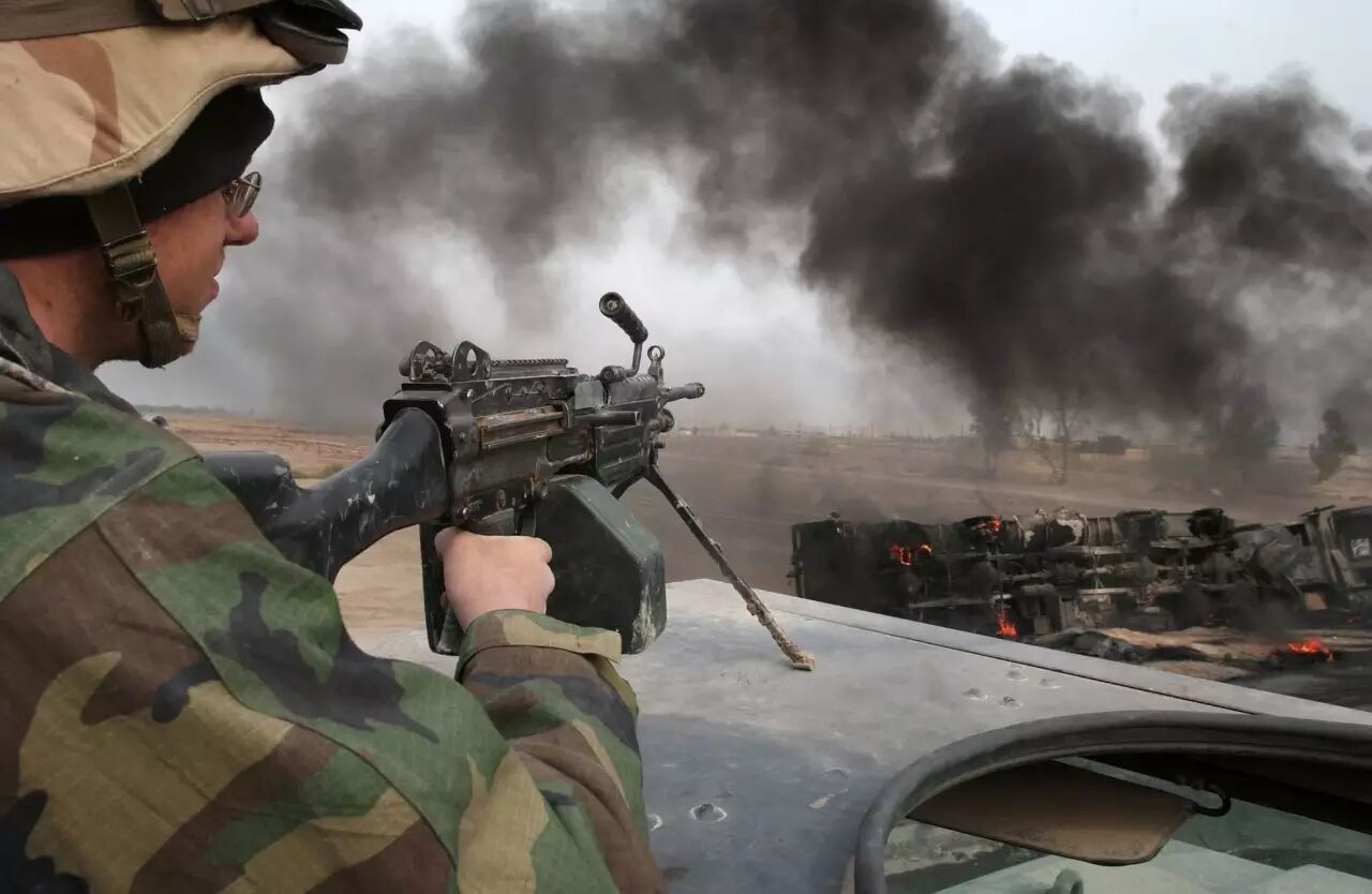 2003年3月26日,在伊拉克首都巴格达以南的一条公路上,美军在遭到伊军的迫击炮轰击后,马上利用掩体进行作战。