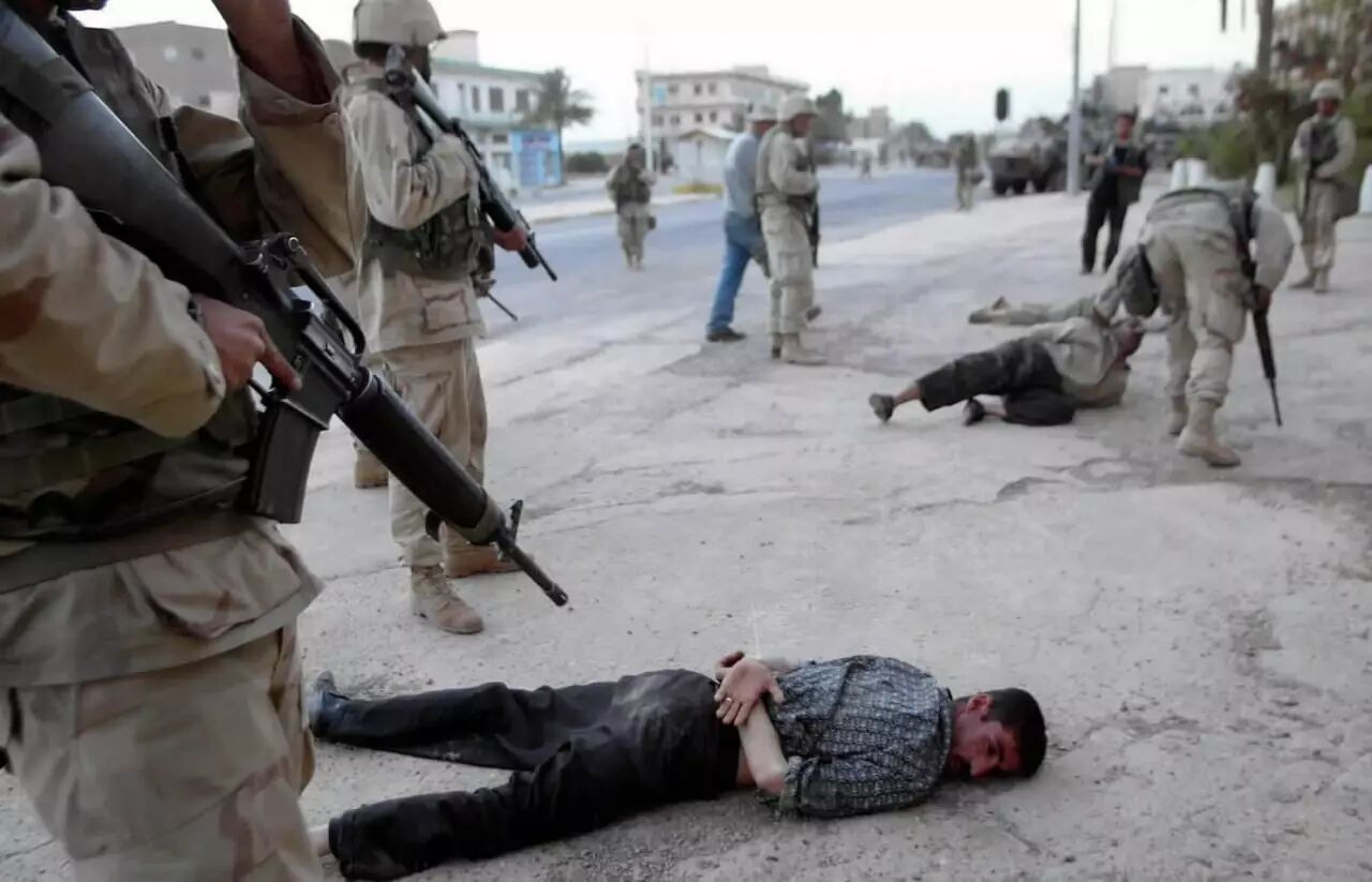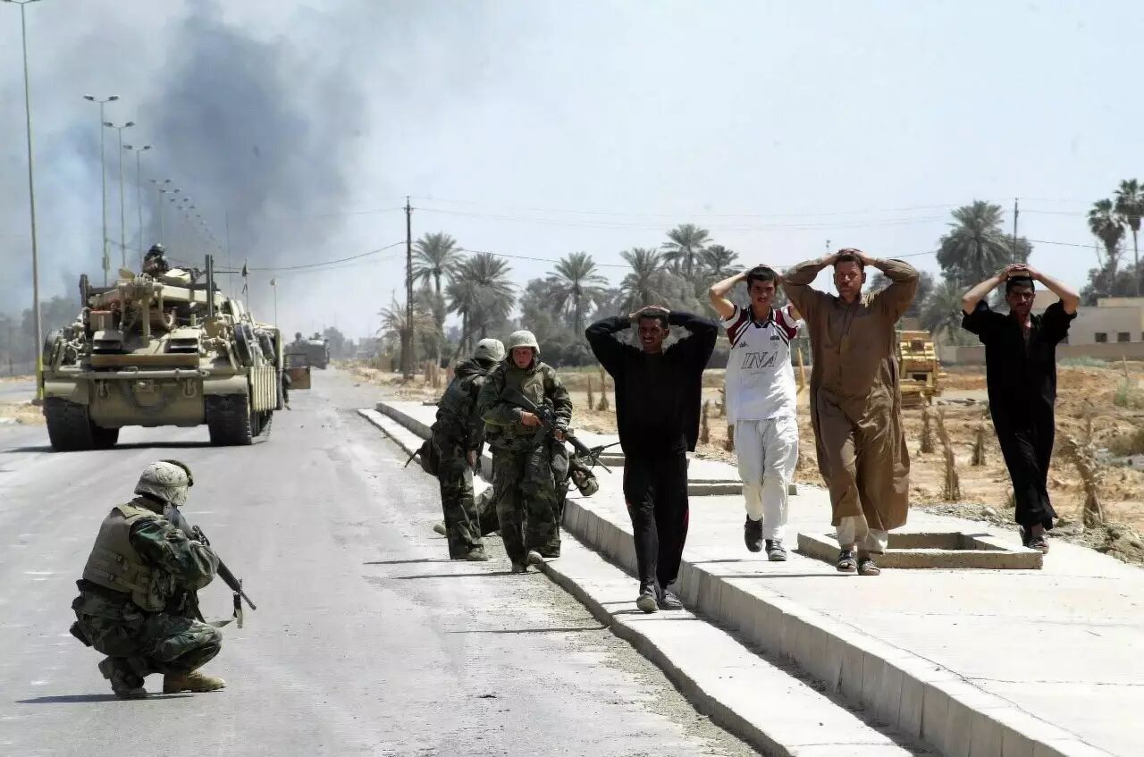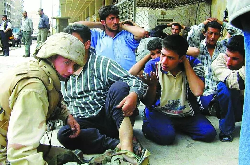 2003年4月9日,在巴格达东北郊的短暂交火后,抵抗联军的“可疑人物”被联军围捕并集中看管,等待询问。