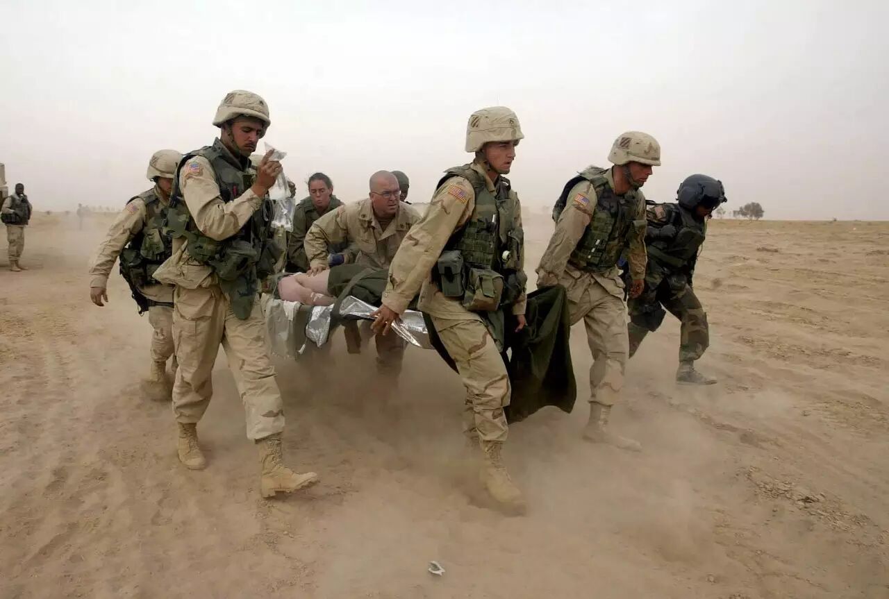 2003年4月5日,在美军向巴格达推进的行动中,几名美国军人用担架抬着一名在作战中受伤的士兵,走向一架军用急救直升机。(新华社/图)