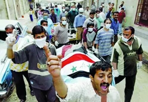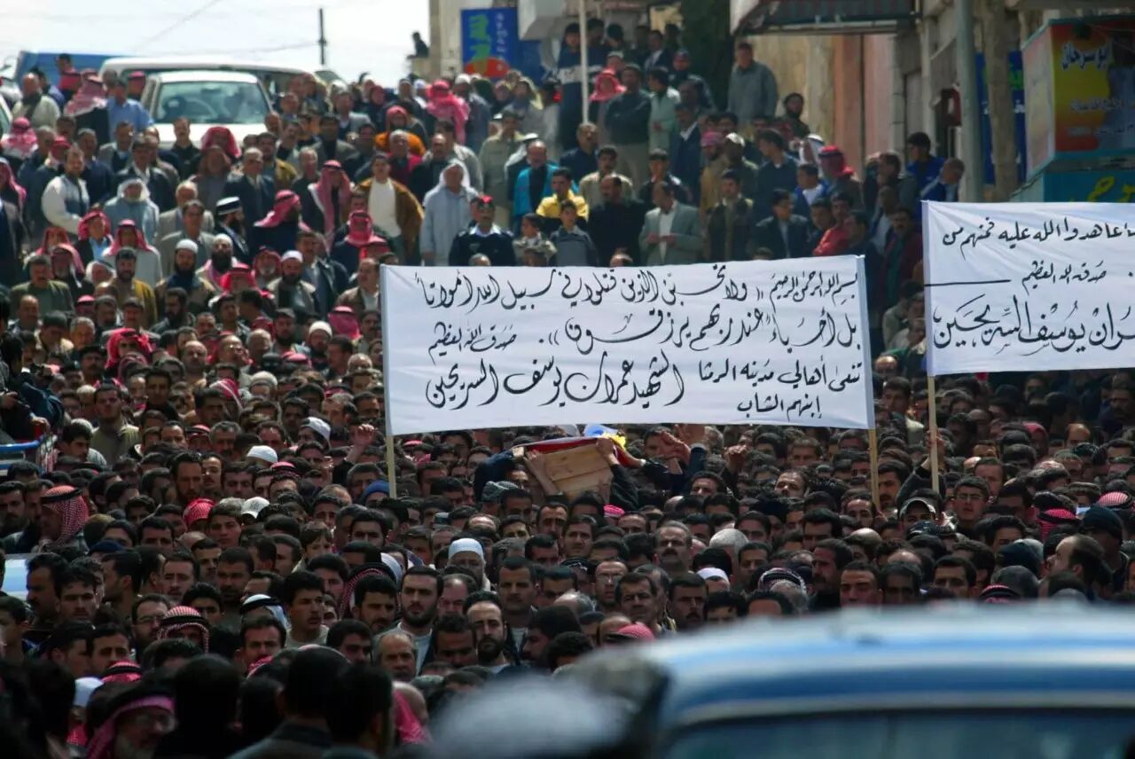 2003年3月27日,在约旦北方城市伊尔比德,大批群众在为一名遇难同胞送葬。当天,成千上万的约旦人涌上街头,分别为4名于本月22日在伊拉克境内遭美英联军空袭而丧生的约旦留学生送葬。(新华社记者龚兵/图)3月24日,摩苏尔遭遇美国主导的国际联军空袭,230余名平民死亡,这是自2003年以来,美国空中军事行动造成的最大规模平民伤亡。