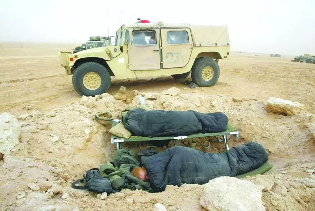 2003年3月25日,两名美军101空降师士兵在伊拉克南部的弹坑里睡觉。据报道,美英联军已抵达巴格达以南80公里处。(新华社/图)