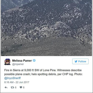 目击者发布在推特上的照片,可以看到全球鹰坠毁在国家公园内的一座山上,所幸并没有造成地面人员伤亡 当时,这架“全球鹰”正在从爱德华兹空军基地返回贝拉空军基地的路上,无人机由一名在帕姆代尔的工作人员控制。