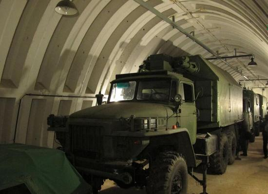 图为停放在地堡地下车库内的乌拉尔军用通信车。