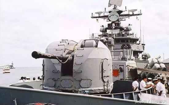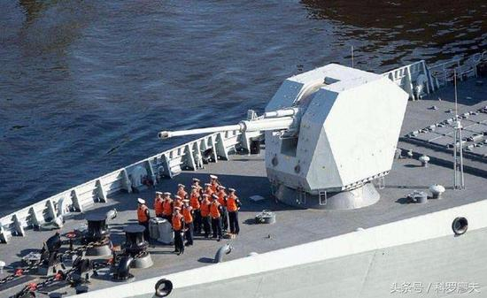 图为俄罗斯现代级的双联130毫米舰炮,炮塔下面还是堆积着一坨一坨的“粑粑”。