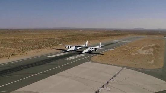 “同温层发射”飞机的后方视角,两个机体之间的距离非常大。由于该飞机采用独特的双机体设计,因此在问世以后就引起了外界的担忧,它如果飞向空中,会不会从中间断掉?就是否会发生这样的情况,也得等到首次试飞升空之后才能得出答案。