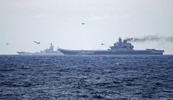 资料图片:英海军战舰拍摄的“库兹涅佐夫”号航母编队在挪威外海进行演习。
