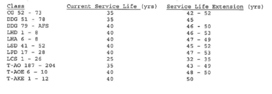 文件显示,不同的船只的延寿升级标准不一样,文件建议将早期(flight 1A)的阿利伯克驱逐舰服役期限延长到45年,而后期的阿利伯克(flight 3A)服役期限延长到46到50年。它还建议将提康德罗加级巡洋舰的服役期限从42年延长至52年,濒海战斗舰从25年上升到32到35年;而两栖攻击舰服役期限则长达53年之久。
