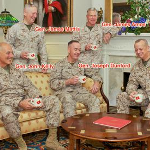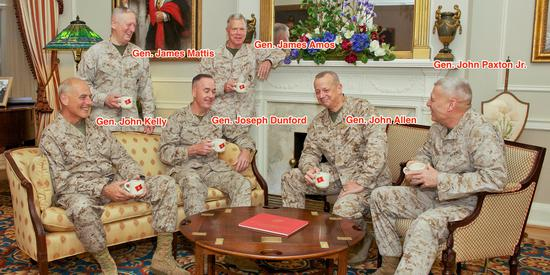 照片上的6位上将,从左到右分别是前白宫幕僚长约翰•凯利(John Kelly)、即将离职的国防部长马蒂斯(Jim Mattis)、参谋长联席会议主席约瑟夫•邓福德(Joseph Dunford)、美国海军陆战队第35任司令詹姆斯•阿莫斯(James Amos)、美国驻阿富汗部队前最高指挥官约翰•艾伦(John Allen)、海军陆战队第33任助理司令小约翰•帕克斯顿(John M。 Paxton Jr。)。