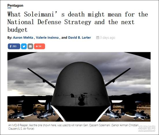 和五角大楼联系密切的“防务新闻”网站,1月4日发表标题为《炸死苏莱曼尼对当前和未来国防预算的影响》的社评。文章援引多位防务专家的话称,随着美军炸死苏莱曼尼引发地区局势紧张,五角大楼可能将在海湾地区重新进行投资。
