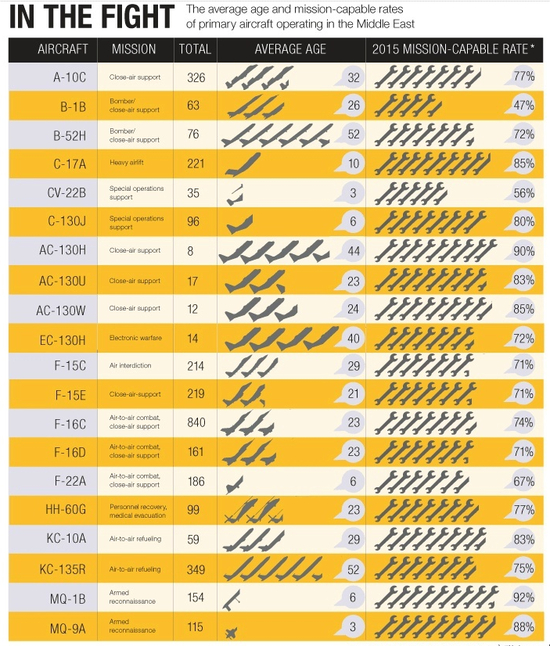 根据美国管理和预算办公室公布的数据,美国军方仍然依赖许多较老的飞机,美国空军机队中的预警机、运输机、战场指挥机等辅助机已经服役近30年。而加油机机队和RC-135侦察机机队均服役50年以上。根据《空军时报》发布的统计数据,空军的整体任务完成率已经从2012年的77.9%下降到2018年的69.9%