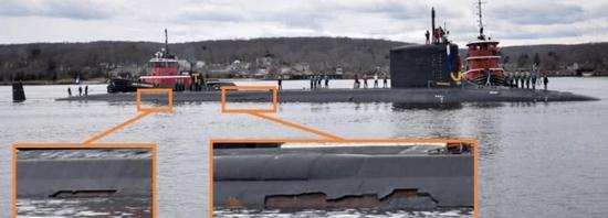 另一个角度看早前曝光的美军弗吉尼亚级核潜艇首部消声瓦脱落情况。