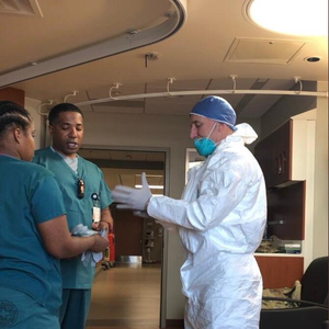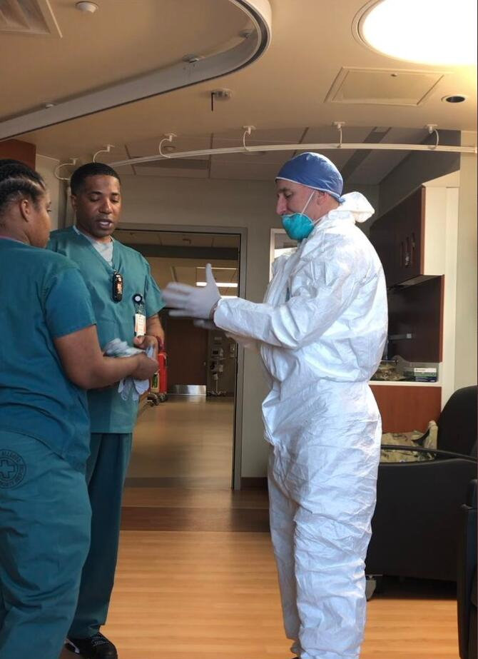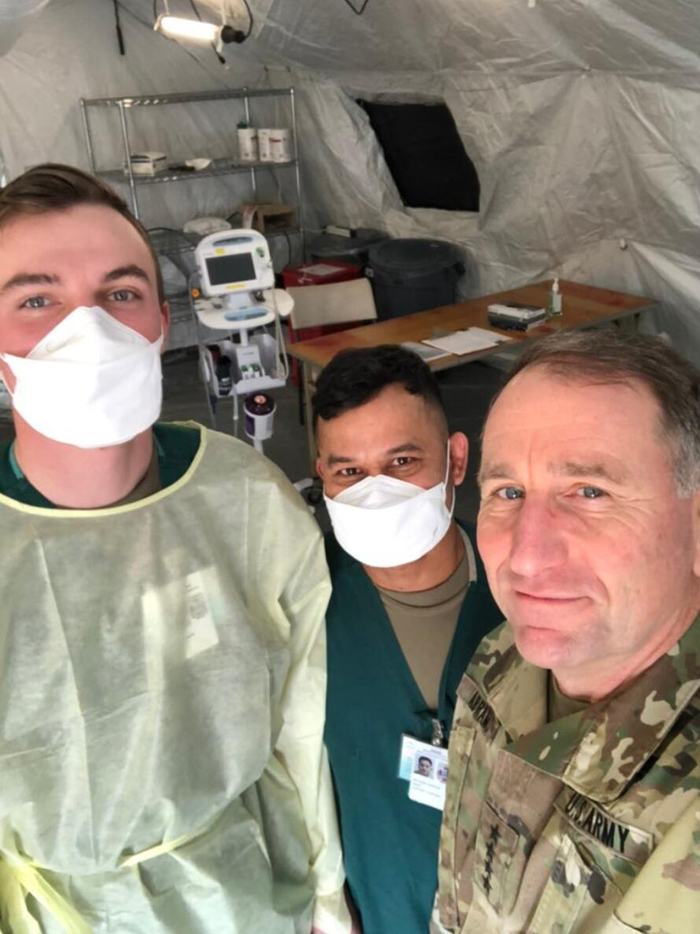 艾布拉姆斯还与正在急诊室内值班的两名美军医护人员合影,这些医护人员主要任务是对任何出现感染症状的人进行检查,艾布拉姆斯称赞说:“他们站在预防疾病传播的一线,我为能与他们并肩作战感到自豪。”
