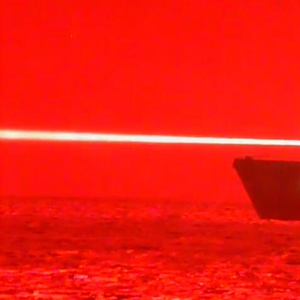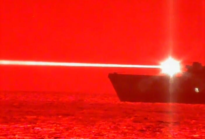 “波特兰”号两栖船坞登陆舰舰载固态激光武器系统演示器的试验视频,试验在珍珠港基地附近进行。在美军发布的视频短片里可以看到这艘船舰的船头装有激光发射装置,随后出现了一条不是向上、而是沿着海平面的明亮光线。在接下来的画面里可以看到一架发光着火的无人机。