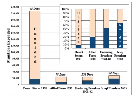 图2 美军在1991年以来四次局部战争(海湾战争、科索沃战争、阿富汗战争、伊拉克战争)的主要空袭行动中消耗的弹药总量及精确制导弹药数量
