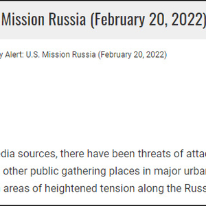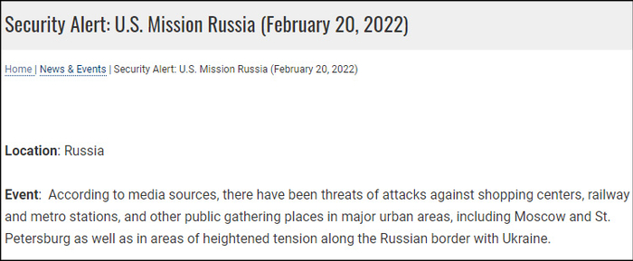 美国使馆在这份简短的声明中写道:“据媒体消息,在莫斯科、圣彼得堡及俄乌边境紧张地区的主要城区,购物中心、铁路、地铁站及其他公共集会场所面临袭击威胁。”