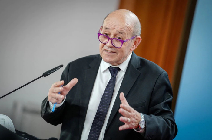 2022年2月23日,在德国柏林,法国外长让-伊夫·勒德里安在外交部举行的新闻发布会上发表讲话。图自路透社