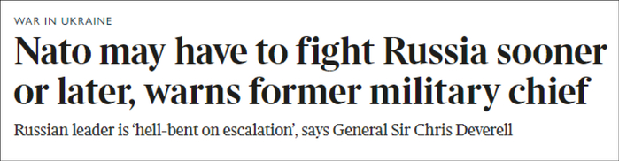 当地时间3月7日,《泰晤士报》报道称,前英国高级军事负责人克里斯·戴福瑞尔(Chris Deverell)将军声称,俄罗斯总统普京已决意让俄乌军事冲突升级,北约打击俄罗斯只是时间问题,所以不必再担心设置禁飞区导致“冲突升级”的问题。
