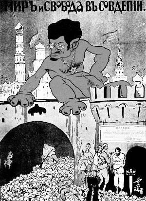 苏联1919年宣传画。画面上方的是当时指挥红军对抗国际干涉的托洛斯基,下方则是干涉军造成的累累白骨。其中留着辫子的指代中国军队。