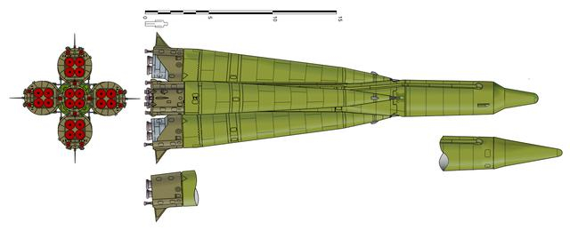 这种巨大的火箭总共有2级,第一级采用RD-107发动机和RD-108发动机,第二级采用RD-108发动机。