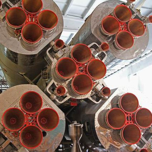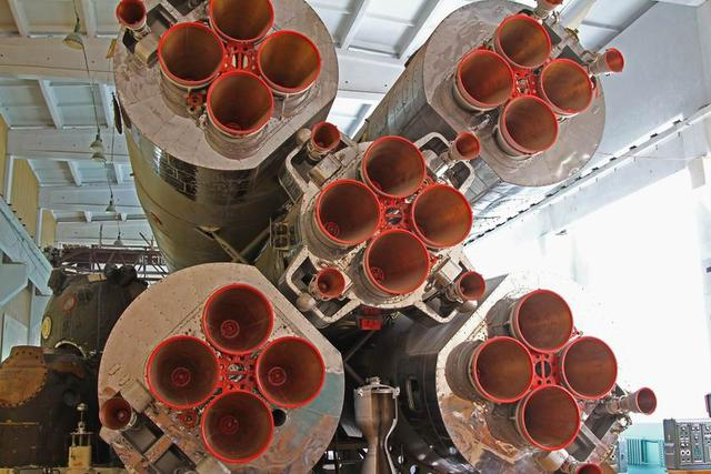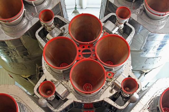 R-7火箭的尾部特写,大家可以看到,除了主尾喷口以外,还有一些小的喷口。