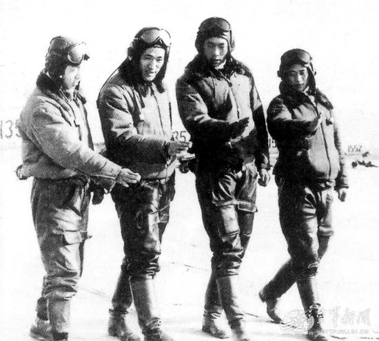 ▲正在探讨空战战术的“李世英中队”(左起:闫清水、李世英、宋义春、蒋道平)