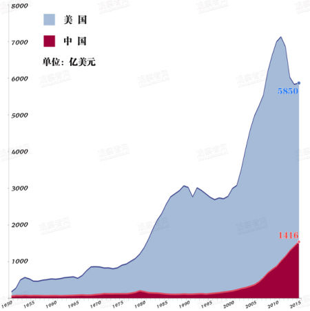 笔者搜集了1950年至今中美两国的军费开支,并按照当年的美元兑人民币汇率重新核算后制成下表。红色部分为中国军队历年军费开支之和,蓝线以下(包括红色部分)则为美国军队历年军费开支之和。差距多大似乎已经不言自明。