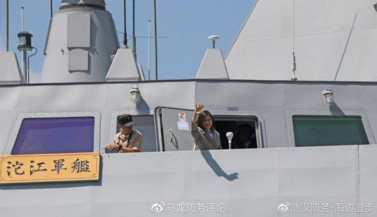 台湾当局领导人蔡英文在沱江舰上根据台媒最新报道,台湾地区防务部门向媒体披露,沱江级军舰原型舰在2015年服役后,后续量产型军舰确定将生产十一艘,并分三批进行量产。