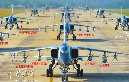 海军战术攻击机使用的国产空舰导弹有鹰击-83、鹰击-91A两种型号。鹰击-12超音速反舰导弹主要由轰-6G轰炸机挂载使用。鹰击-83分为雷达制导型、红外成像制导型,其中红外成像导引头可以提供10千米以上的探测距离,可以让导弹具备攻击小型、机动目标的能力。鹰击-91A反舰导弹射程不及鹰击-83,在100千米左右,但其超音速飞行能力大大缩短了攻击时间。
