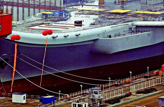 中国首艘国产航母旁还飘起了气球从正式发布的照片来看,现在17号“山东”舰的甲板上,现在已经基本是空空荡荡了,所有阻碍下水的东西已全部清理了。预计在甲板四周的彩旗插满后,紧接着就是挂起满旗了——这才是下水这类重大仪式必须要做的。经过这些装饰后,原本单调的完全是海军灰色的17号“山东”舰,一下子生动起来,咋看都是满满的喜庆气氛。