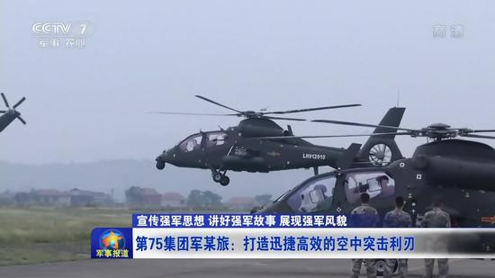 央视新闻中介绍随着命令的下达第75集团军某旅的武装直升机,运输直升机按梯次起飞。这次训练要对陆空一体化指挥的真实性和准确度进行检验,这个旅要求飞行员结合空中突击作战任务需求,强化对步兵指挥要素战斗编组战法战术的理解。