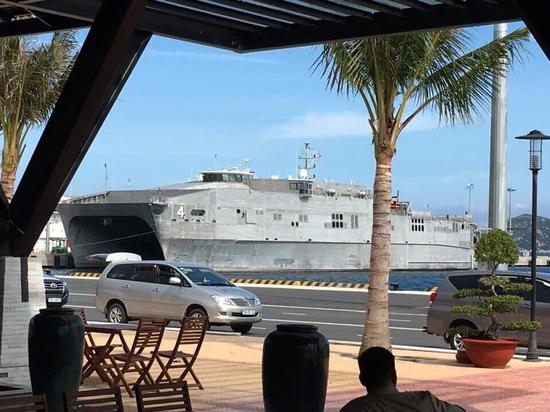 近日停靠于越南金兰湾的美国海军高速运输舰“Fall River”号。此前解放军报、新华社以及央视等媒体多次报道过,中国海军现在在南沙岛礁不但具备了“飞豹”战斗轰炸机的昼夜起降和出动能力,还有专门组建的南沙护卫舰大队,其装备的056轻型导弹护卫舰、22型导弹快艇等舰艇,定期在南沙群岛展开巡航。