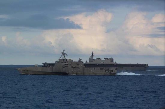 虽然此前7个月美国海军舰艇都没有闯进我国南海岛礁附近海域,但不代表南海就没有美军军舰了。除了今年2月在南海很是蹭了一段时间热点的“卡尔文森”号航母以外,美军包括“韦恩·梅耶”号(DDG-108)在内的数艘“阿利·伯克”级导弹驱逐舰一直游弋在菲律宾海、南海等海域;长期部署在新加坡的濒海战斗舰“科罗拉多”号也时常在南海海域进行演练。在这些作战舰艇以外,美军高速运输舰、携带曾被中国海军舰船“捞走”的无人潜航器的间谍船等,都没有停止过在南海的活动。