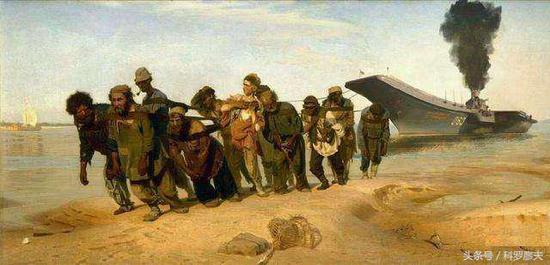 有网友幽默的用俄国著名油画做了张图片来讽刺库舰:这航母不仅能烧劈柴,还配有纤夫。
