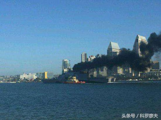2016年2月美国海军首艘LCS濒海战斗舰自由号正在圣迭戈海岸线航行,滚滚浓烟,仿佛挨了一枚反舰导弹。