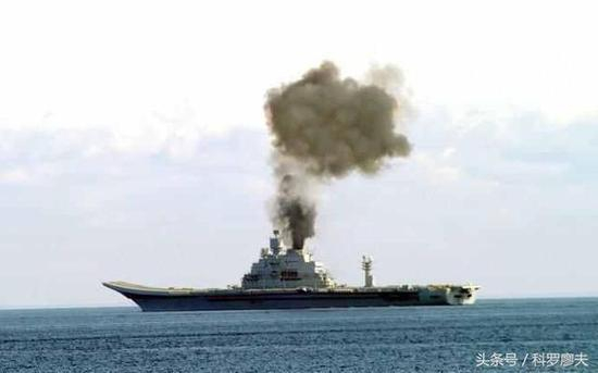 这是冒黑烟的印度航母超日王号,也可能是刚点火,炉子里的劈柴还有点潮。