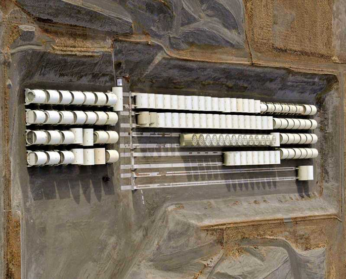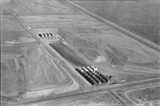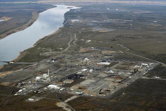 汉福德区的工厂设施鸟瞰。除了工厂之外,这里人烟稀少,旁边有条河流。退役的舰用核反应堆可通过水路来到这里,其目的地是第94号存放点。随着退役舰艇和潜艇的增加,第94号存放点的反应堆舱越来越多,目前已增加至100多座。