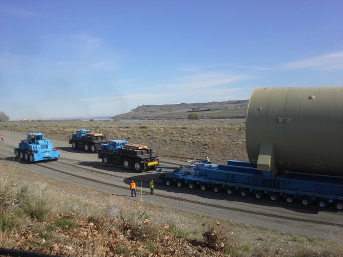 从陆路将核反应堆舱运往第94号反应堆存放点。运送一个核反应堆舱需要大马力的卡车,而且拖挂的平板车十分巨大。此照片之中,我们仅仅看到半截平板车,就已有至少13对轮子。要将这么大的物件运送目的地,进行封路是必不可少的。