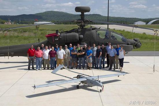 在美国,AH-64“阿帕奇”武装直升机正在发展相关的作战能力,例如下图AH-64与RQ-7“影子”侦察无人机联合作战的研究。但目前美军相关工作也处在科研阶段,尚未有装备服役的报道。