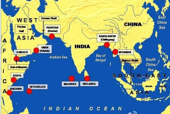 吉布提基地、汉班托特港、科伦坡港、瓜德尔港、吉大港。如果将这几条港口连起来的话,我们就会发现,中国从红海咽喉——阿拉伯海——保克海峡——东印度洋——安达曼海,织起了一张大网。这张大网几乎囊括了中国西出印度洋所有的生命线。只要掌控了这张大网,中国就再也不担心美国和印度在印度洋对中国进行战略封锁。反而,印度完全处于中国的战略封锁之中!