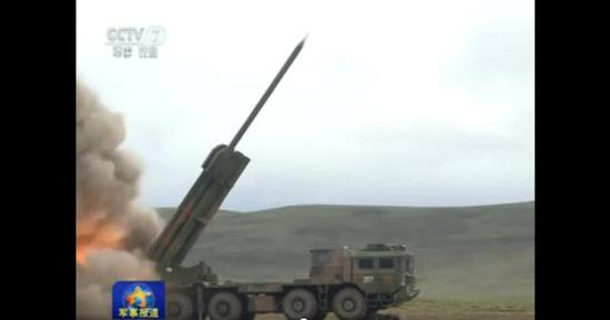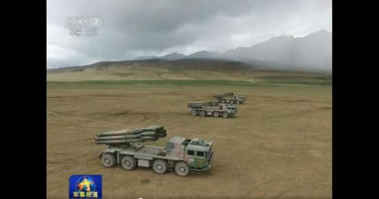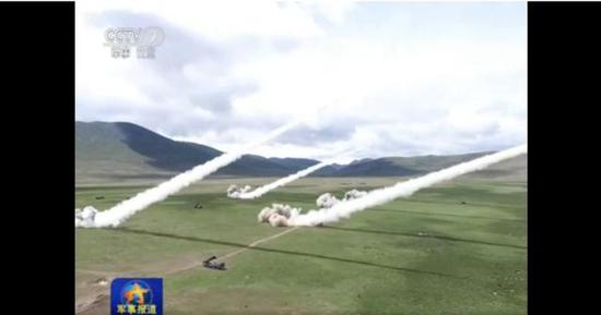 图片:7月19日央视军事报道公布的西藏军区某炮兵团的远程火箭炮实弹射击的视频截图。