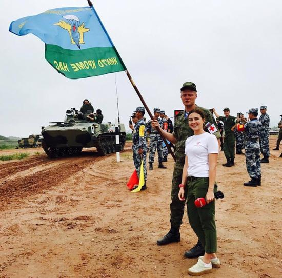 俄罗斯战车的发车仪式,图为其红星电视台记者萨莎,她本人在这项赛事中受到的关注远大于BMD-2和俄罗斯。
