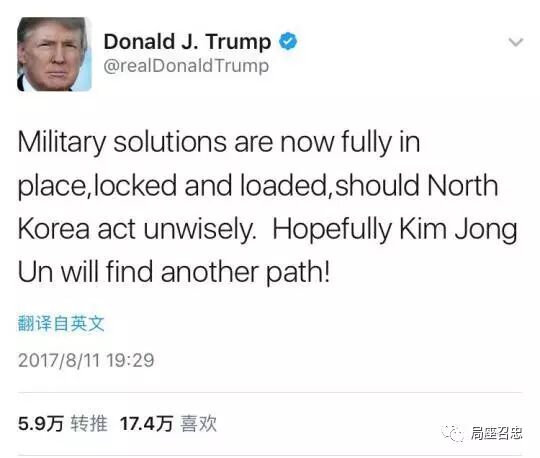 这就有了开头,美朝怼出天际的一周连续剧。局座说,朝鲜问题再一次要把中国带到沟里去了。