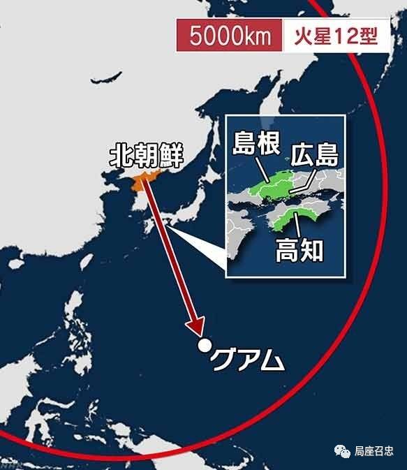 ▲日媒绘制的朝鲜导弹打击关岛路线15日清晨朝鲜又放出消息,已经有两周未公开露面的朝鲜最高领导人金正恩,14日视察了朝鲜人民军战略军司令部,听取了这个“关岛包围射击方案”的报告。