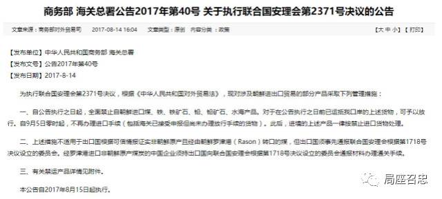 在14号美国说要进行301贸易调查的当天,中国的商务部和海关总署联合发布公告,说从8月15号开始,就全面禁止从朝鲜进口煤、铁、铁矿石等等等等一些产品,就是说中国被迫又开始对朝鲜进行禁运,禁止从朝鲜出口,也不向朝鲜出口,那朝鲜又该开骂了。
