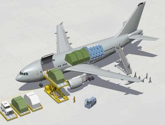 图:地板下运油,上面运货物和人西方目前主流的加油机设计,是将整个机身舱体用地板分隔为上下两个部分;额外的油箱分布在地板以下,地板以上的空间,分隔出人员运输舱和货物运输舱。这种飞机在使用过程中,不需要经过任何改动或者设备拆卸,就依然能保留良好的人、货运输功能。