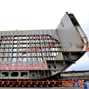 实际应用例如:本月8号,黄埔文冲长洲厂区建造的远洋救助拖船的首个总段——80A总段由自行式模块化运输车稳稳的转至船台车间,标志着长洲厂区终于实现总段造船梦想。该厂区现有8台运输车,每台最大载重144吨,可以承载1152吨的总段。