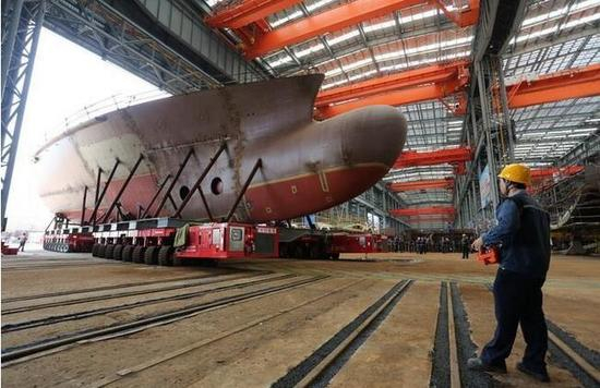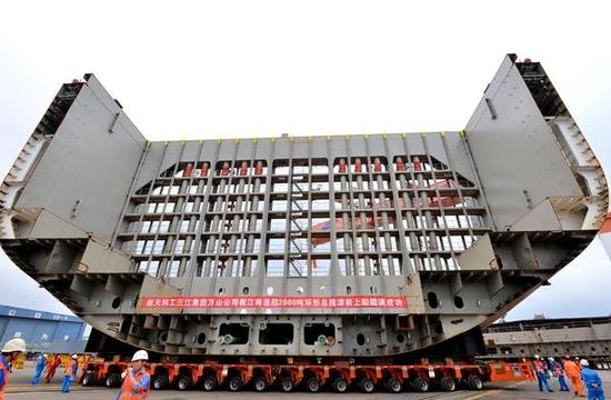关注航母建造的人会发现,我国的首艘国产航母采用的是总段建造法,整艘航母的建造就像搭积木一样拼接而成,而这一块块巨大的积木,就是事先在车间内已经完成装配焊接的立体分段,所以一般当我们看见航母在船坞里建造的时候,其实它已经正式开工很久了,只是那些分段不容易被察觉到。